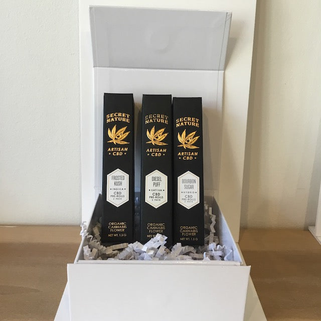 This High CBD Pre-Roll Gift Box is great for those wanting to give cbd smokes a try. Secret Nature pre-rolls are made with premium quality hemp and are available in 2 packs or 7 packs. The sampler pack pictured here would cost $52.